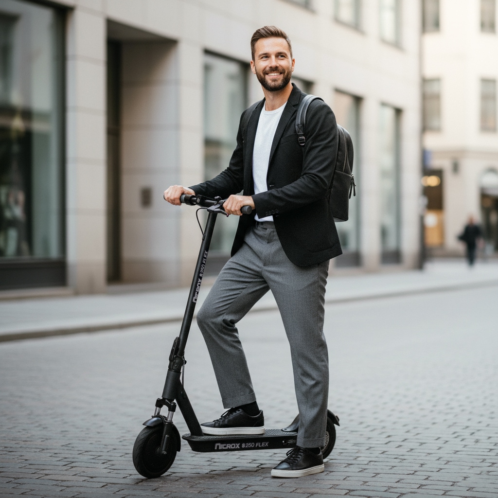 Nitrox S250 Flex drivs av en kraftfull 250W motor och erbjuder en topphastighet på 20 km/t, perfekt för stadsmiljöer. De luftfyllda däcken ger en mjuk körning även på ojämna underlag och med en räckvidd på 25 till 30 km tar den dig enkelt dit du vill. Den klarar dessutom backar utan problem vilket gör den idealisk för varierande terräng.